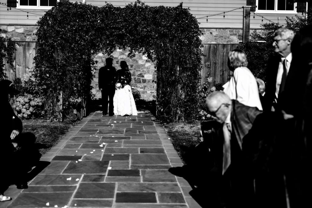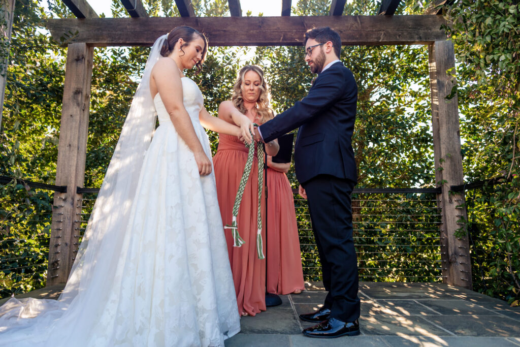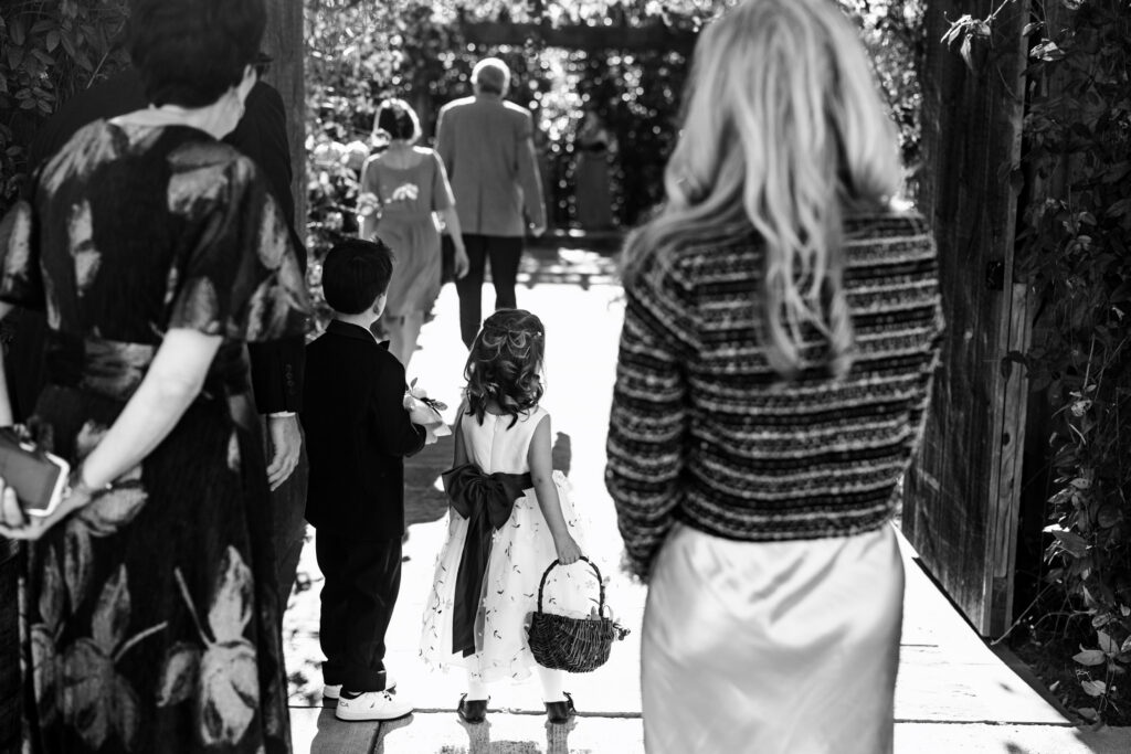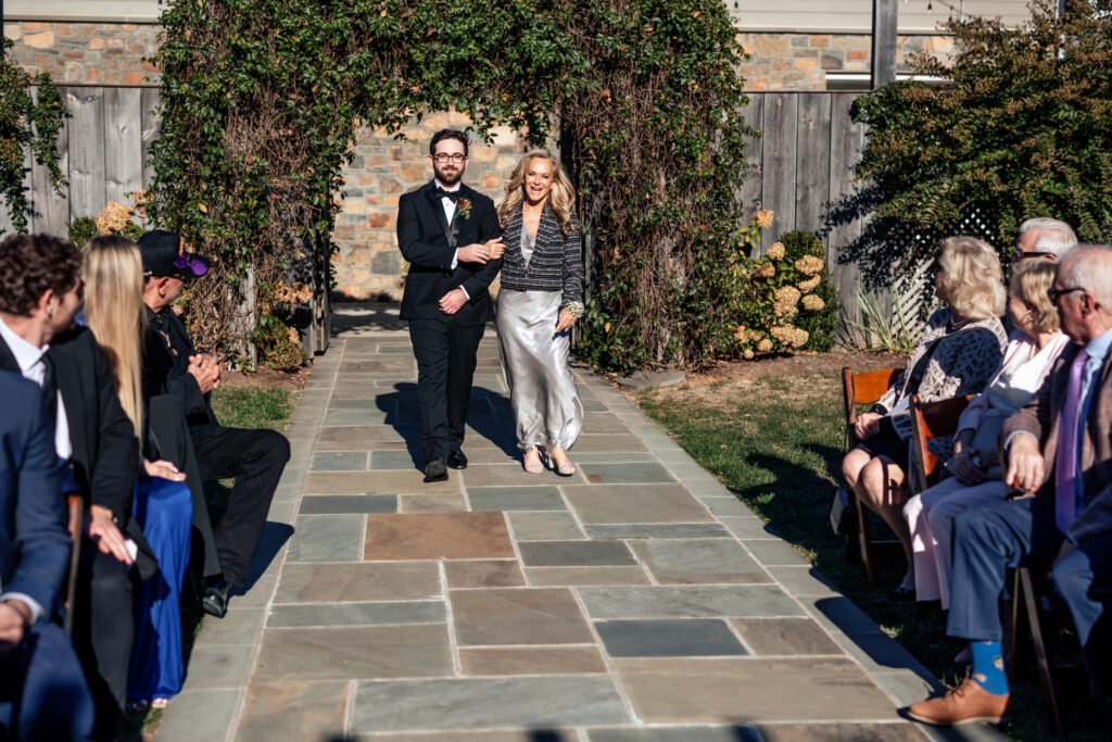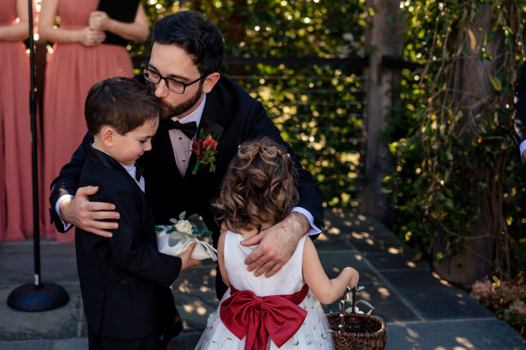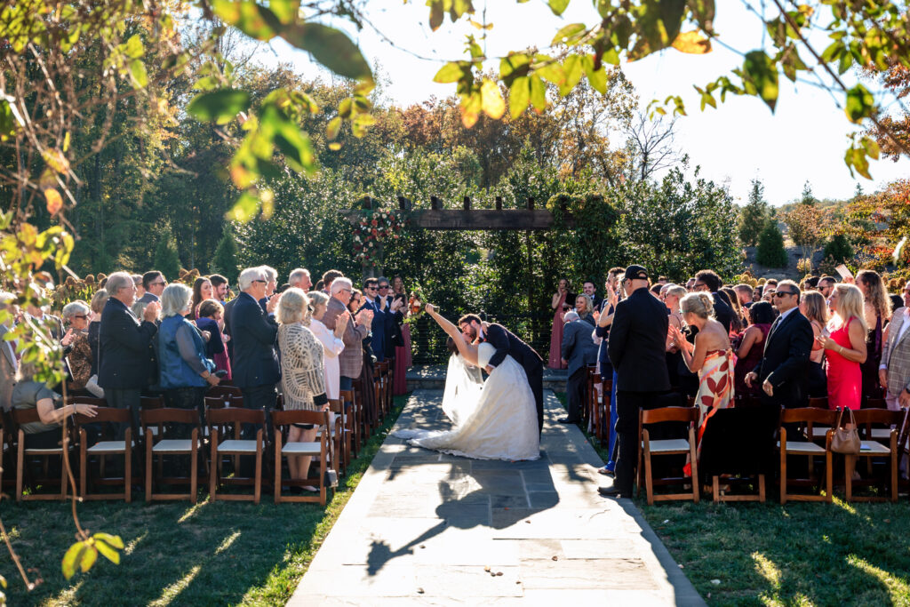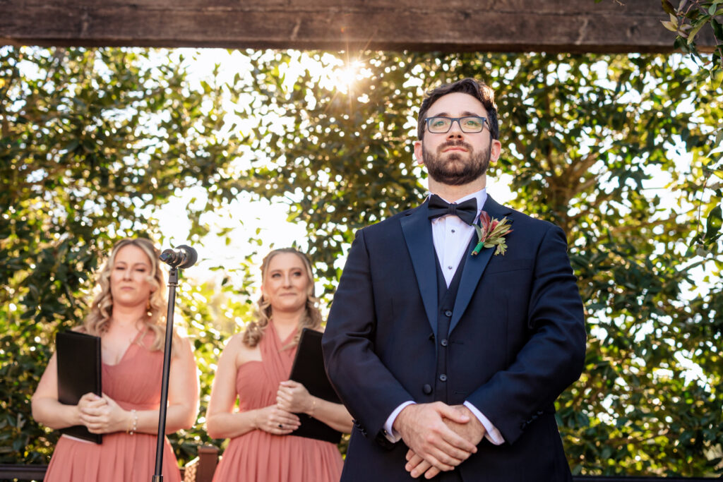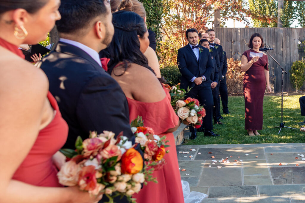 The ceremony unfolded in Fleetwood’s private, tucked-away ceremony garden — completely shielded from the public winery, framed by a wooden pergola and walls of lush greenery. With the foliage burning gold beyond the fence line and florals by Poppy Flowers Co overflowing in deep burgundy and dried botanicals, the garden felt designed for exactly this moment in the season. Planner Amy T Events kept the day moving seamlessly from the first look through the final dance, with the kind of quiet coordination that lets everyone — including the photographer — stay fully present.