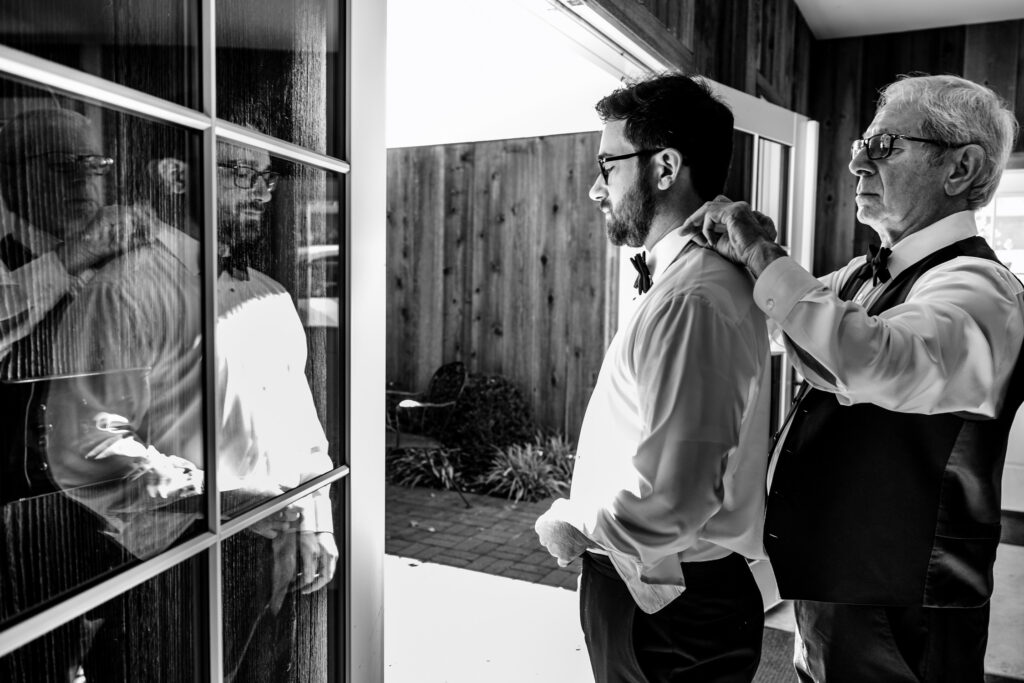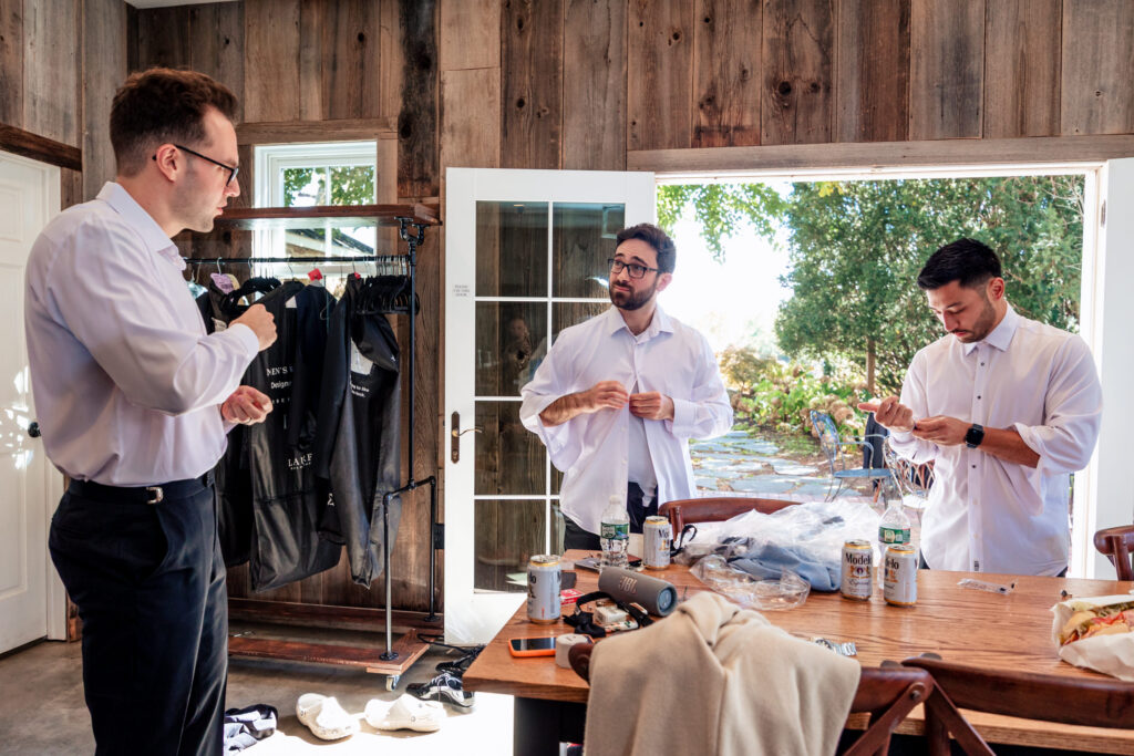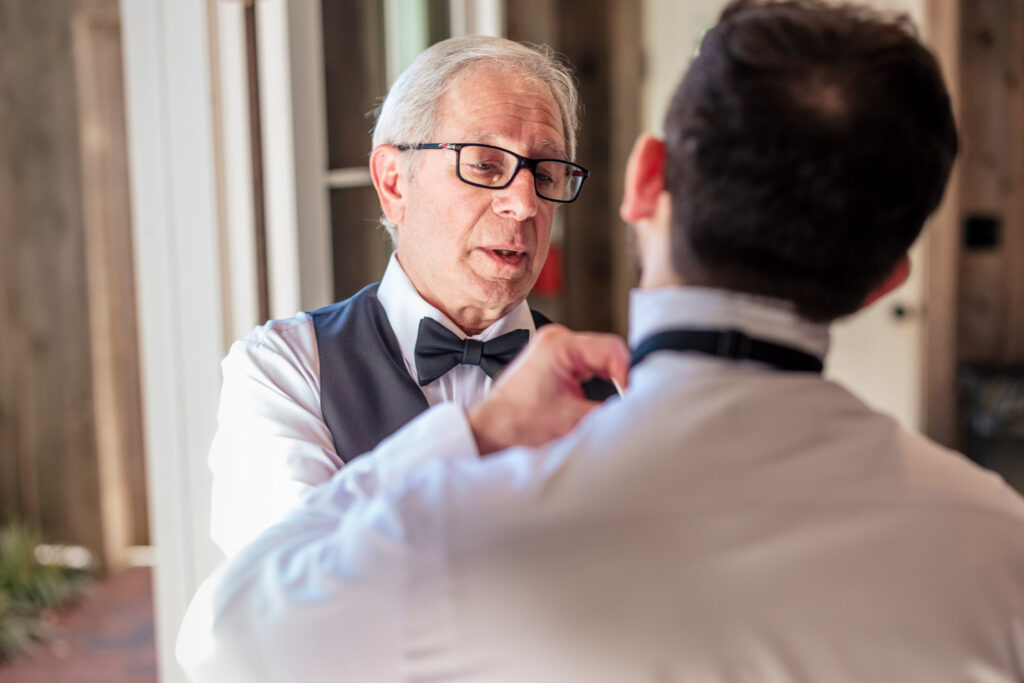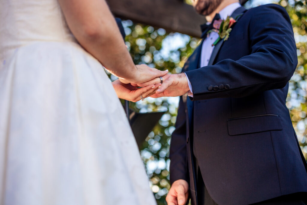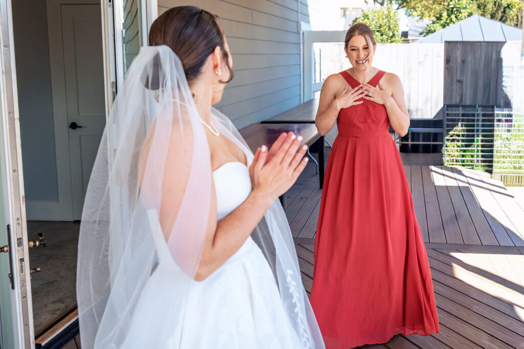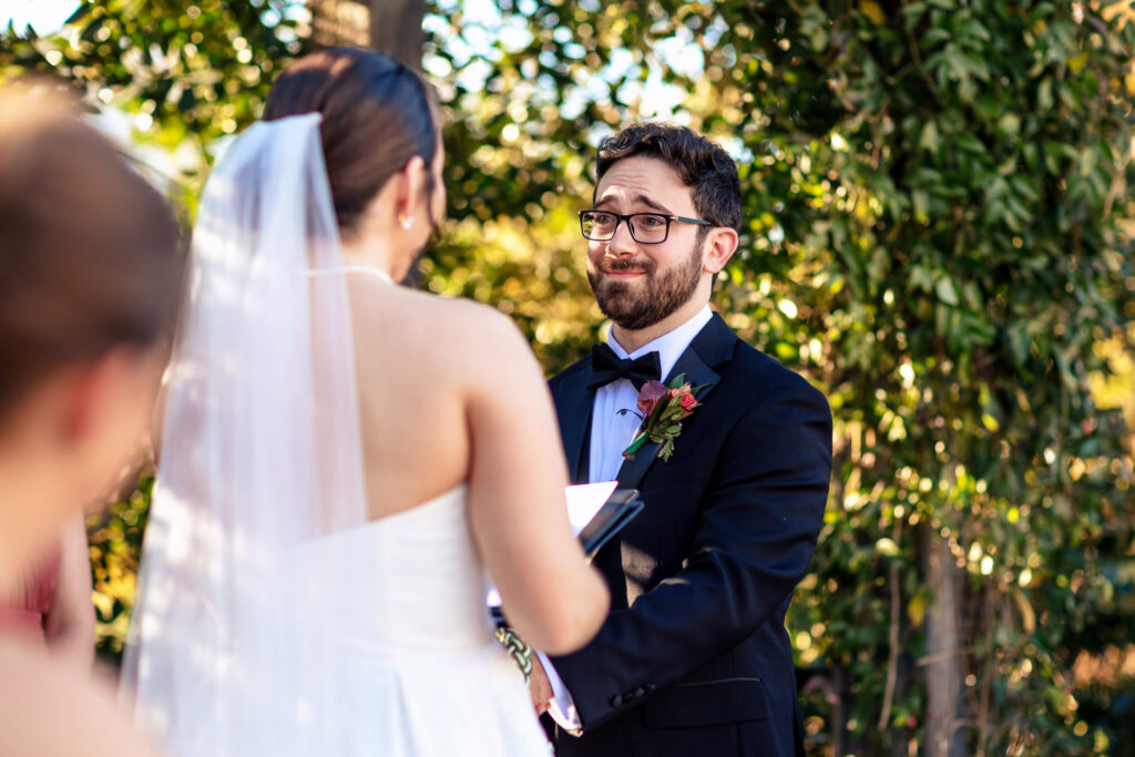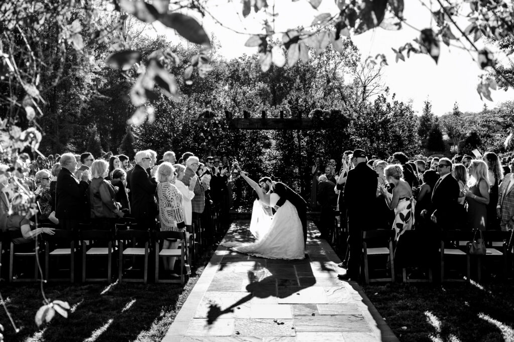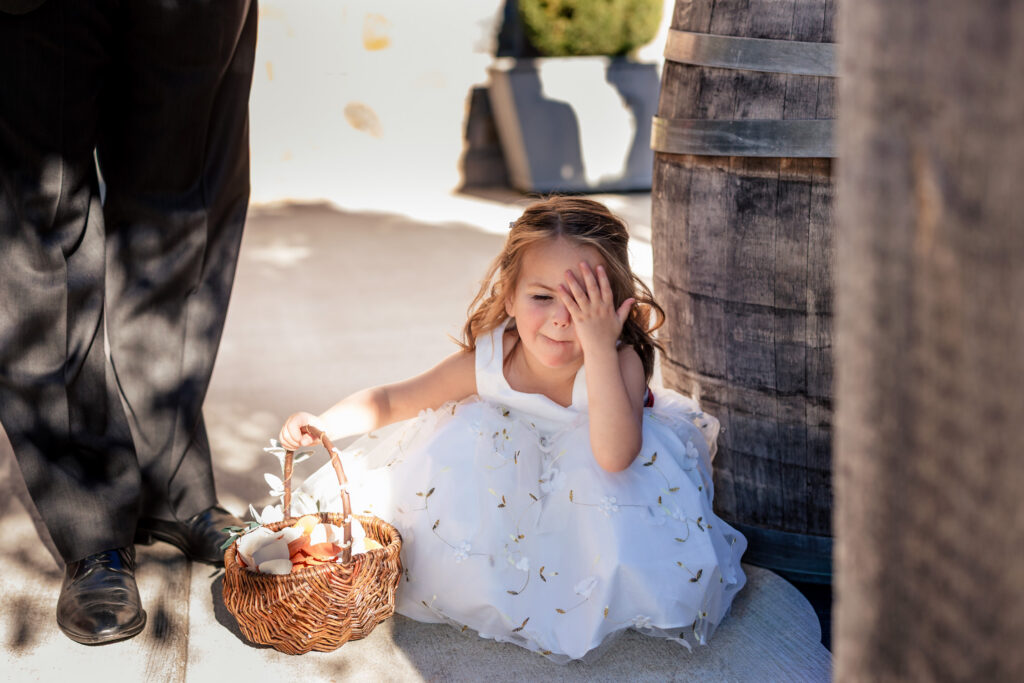 The ceremony unfolded in Fleetwood’s private, tucked-away ceremony garden — completely shielded from the public winery, framed by a wooden pergola and walls of lush greenery. With the foliage burning gold beyond the fence line and florals by Poppy Flowers Co overflowing in deep burgundy and dried botanicals, the garden felt designed for exactly this moment in the season. Planner Amy T Events kept the day moving seamlessly from the first look through the final dance, with the kind of quiet coordination that lets everyone — including the photographer — stay fully present.