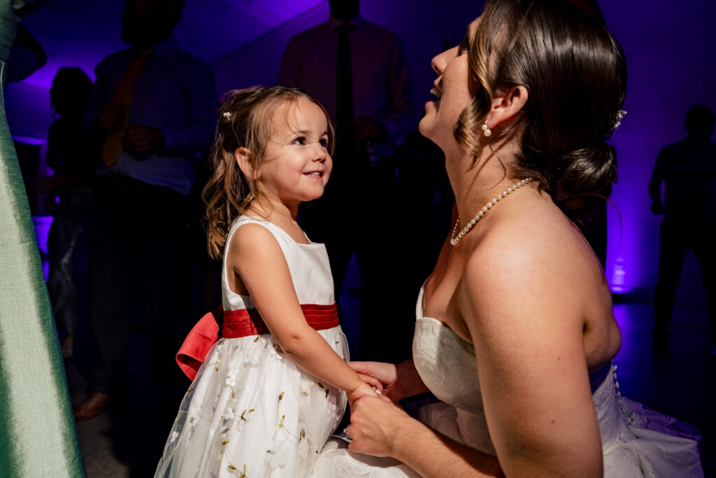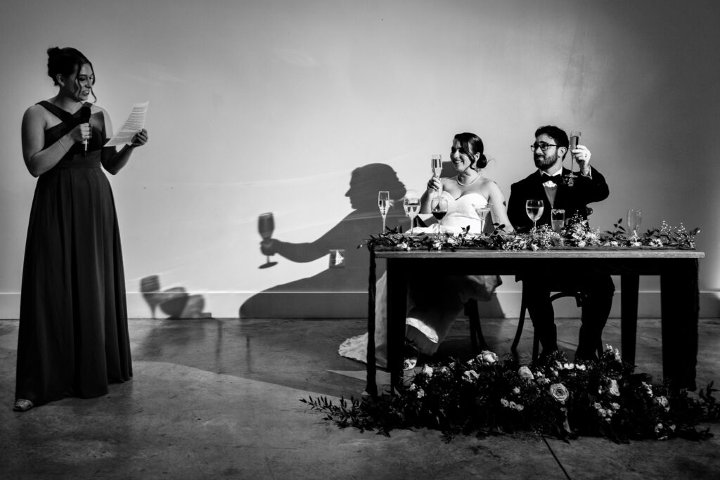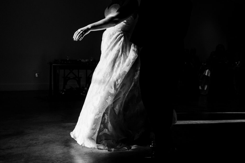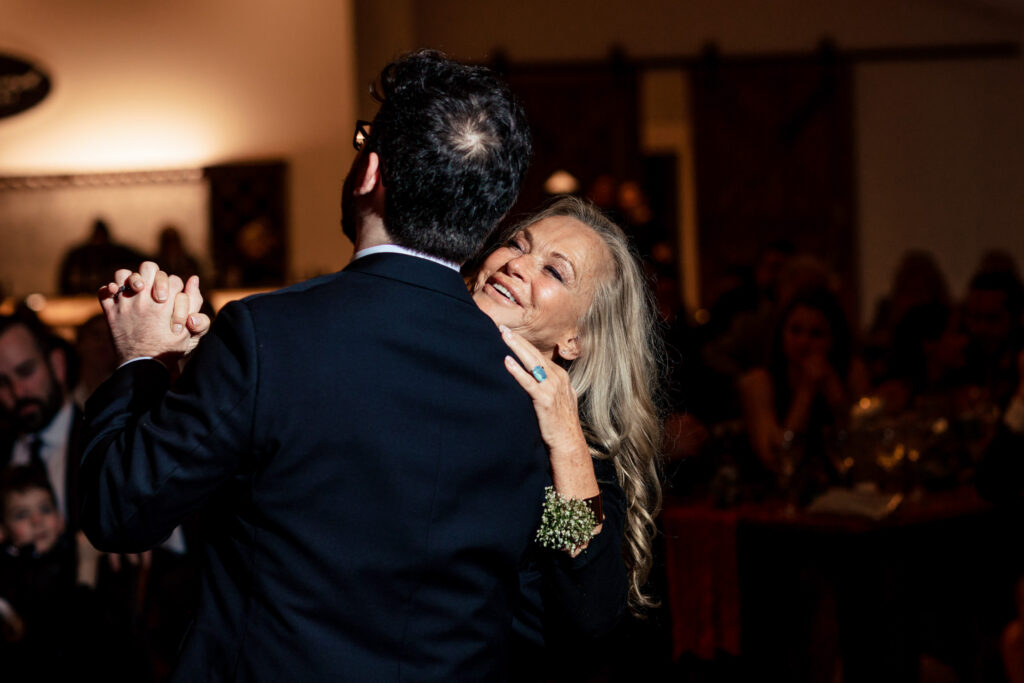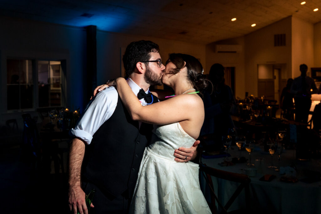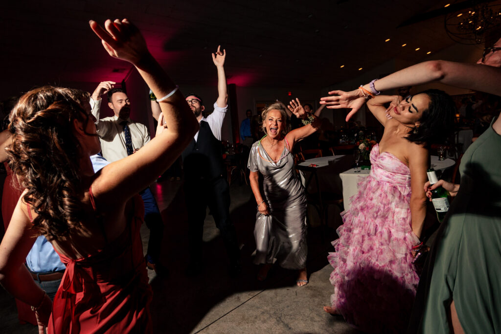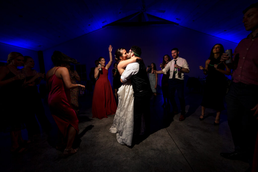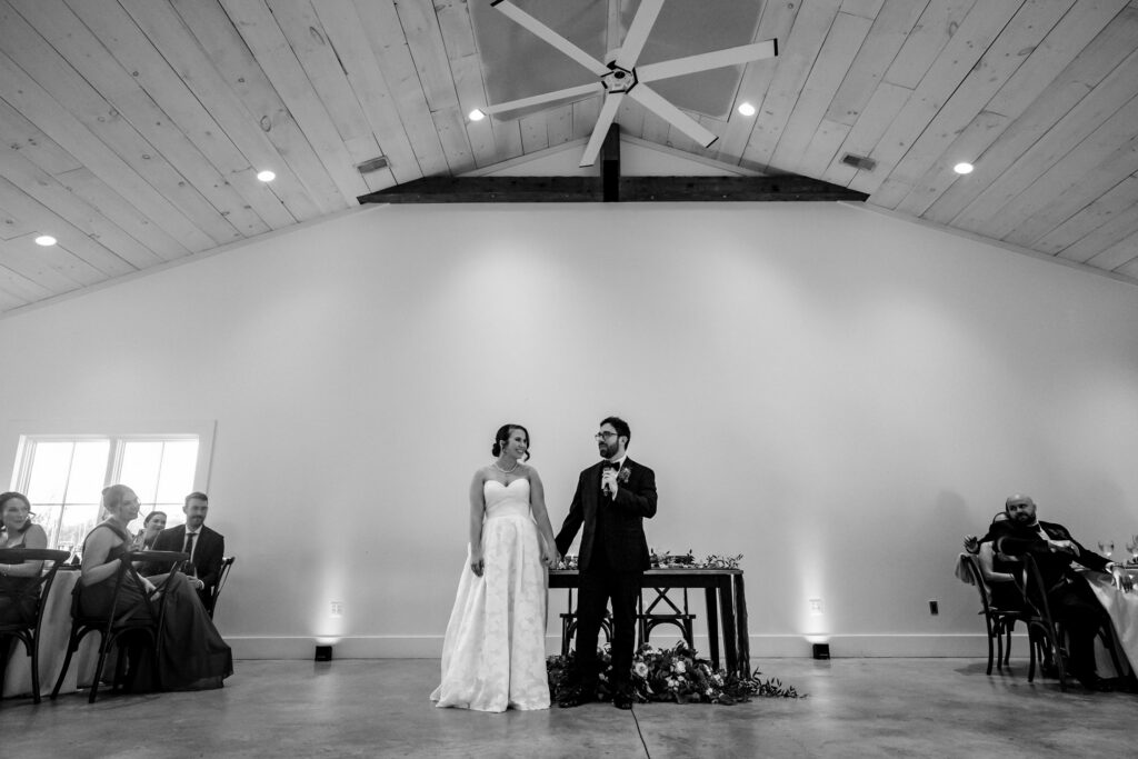 Cocktail hour moved into the Bar and Barrel Room, where bistro lights strung across the brick patio cast a warm glow as guests enjoyed Fleetwood’s estate wine and catering by Monk’s BBQ. As the evening shifted to The Loft, the reception space revealed itself as the blank canvas it was always meant to be — long modern farm tables, candlelight, and Poppy’s florals trailing down the center. Black Tie DMV kept the dance floor full from the first song to the last.