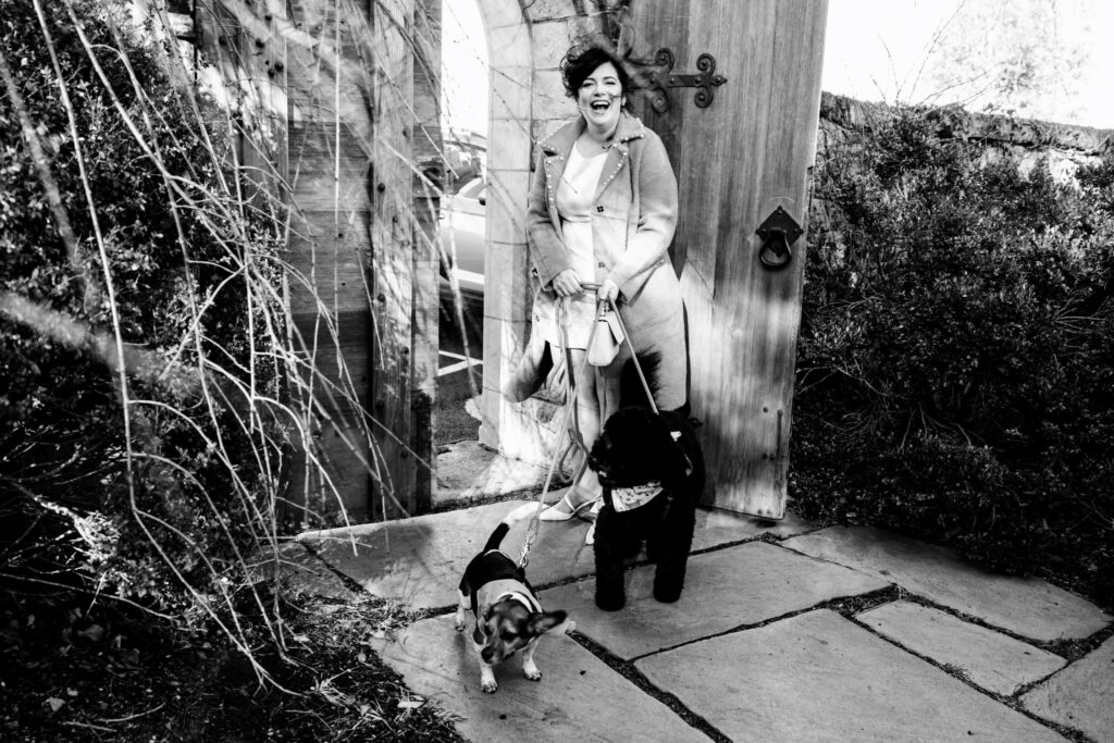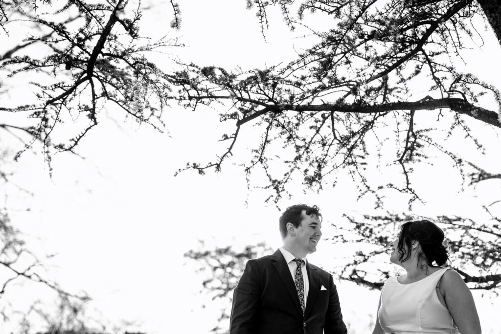 They chose to meet at The Bishop’s Garden without a first look: no staged reveal or dramatic build-up. Just the quiet anticipation of seeing each other for the first time that day in the open air, with winter settling gently around them. The stone arches, the muted sky, the bare trees: everything felt calm and cinematic without trying to be.